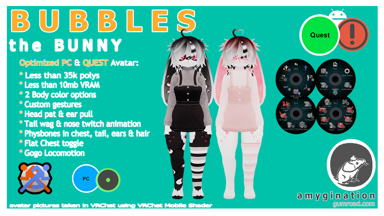 This bouncy bunny comes with 6 versions!!!! 3 Optimized, 1 Unoptimized & 2 QUEST avatars.
