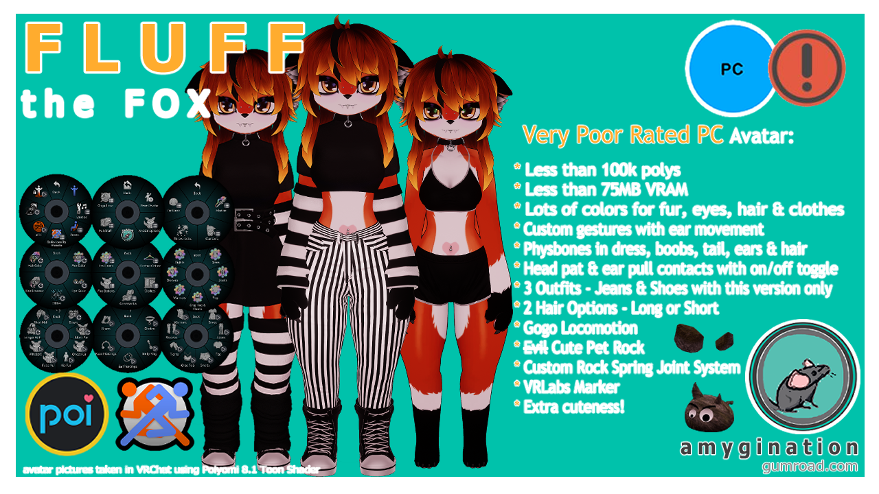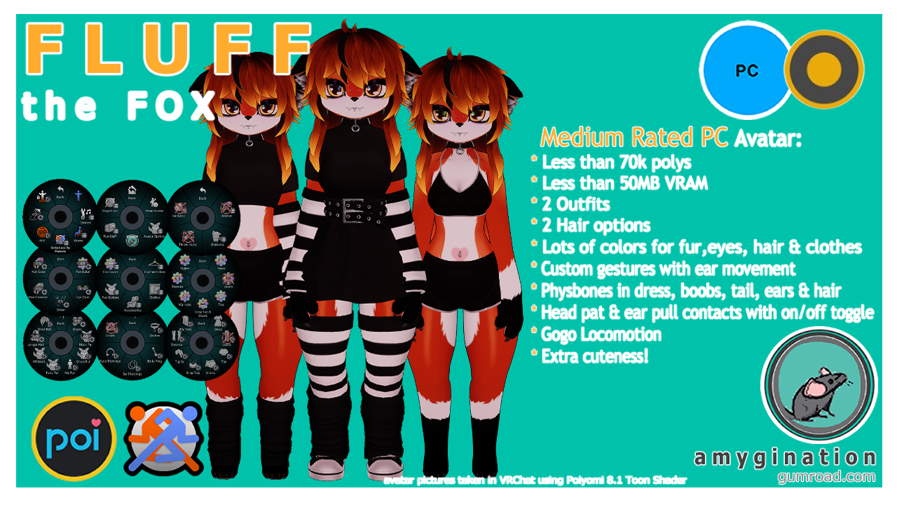 - Customize your body color with glitter, emissions and hue options - Red Fox, Fennec Fox and Arctic Fox (or any color of the rainbow). (PC versions only. However there are 4 color options offered prior to upload in the Unity Package for the Quest version.)